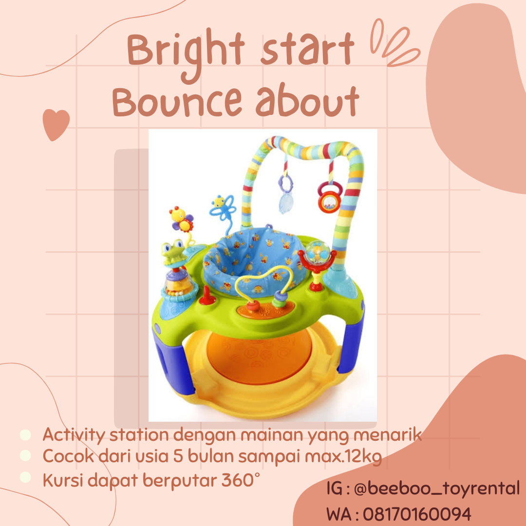 Bounce activity center ini dilengkapi berbagai macam mainan menarik yang dapat dimainkan oleh anak dengan alas kaki yang dapat menjaga kaki agar tidak tersentuh dengan permukaan lantai.