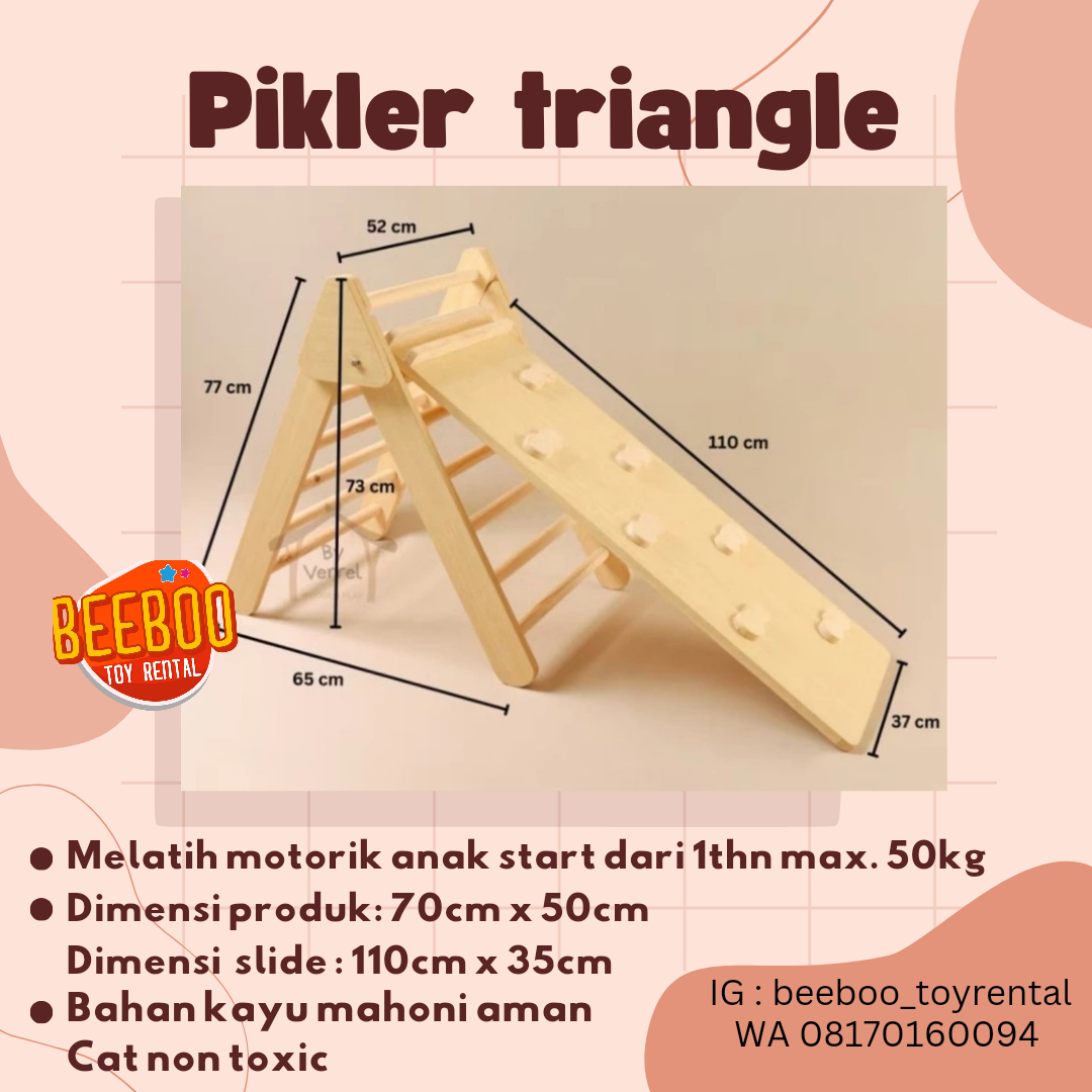 PIKLER TRIANGLE + SLIDE/PROSOTAN READY STOCK FREE packing kayu. Pikler triangle terbuat dari: premium plywood + HPL, anak tangga pinus. Lebih kuat, stabil, dan mulus daripada pinewood. Anak tangga bulat bukan round ended. Salah satu mainan anak yang memfasilitasi kebutuhan perkembangan gross motor anak, pikler triangle ini bisa dipakai dari anak umur 9 bulan ketika belajar merangkak ya parents. Slidenya diturunkan ke paling bawah sehingga anak dapat belajar merangkak pada bidang miring. Slide bisa dibolak-balik jadi untuk manjat (rock climbing) atau prosotan. Tangga bisa dilipat sehingga lebih praktis disimpan ketika tidak dipakai. Dikirim dalam keadaan utuh jadi tidak perlu dirakit lagi lebih praktis ya parents. Finishing halus dan rapi Sudut prosotan membulat/tidak tajam Semua menggunakan finishing waterbased non toxic aman buat anak. Cat menggunakan duco waterbased.
